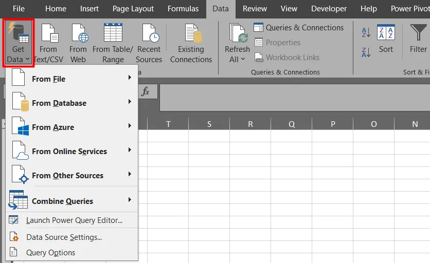 To kickstart your Power Query journey, familiarize yourself with its integration in Excel. You can find it in the “Data” tab under “Get Data”